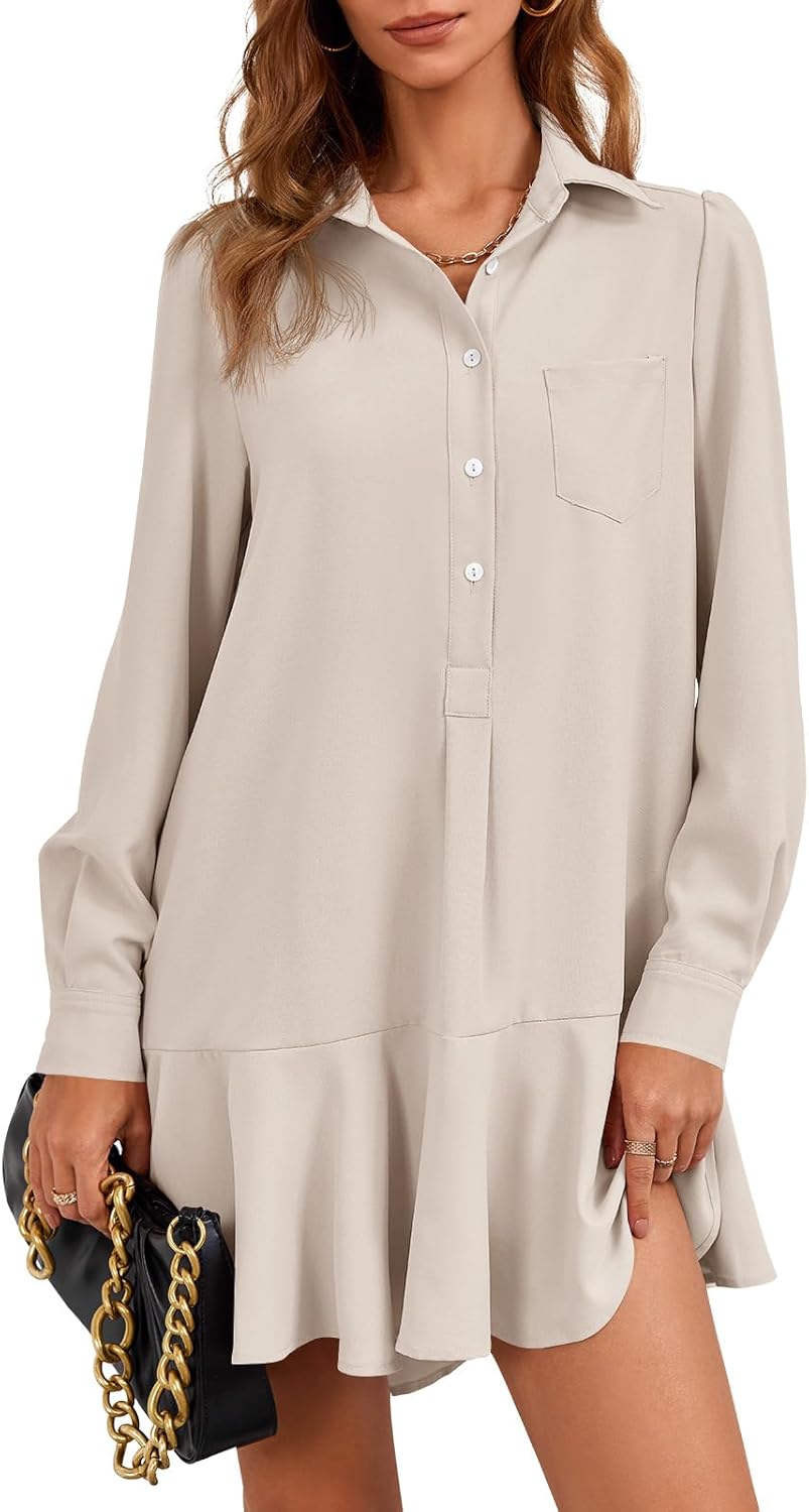 Fisoew Womens Casual Button Down Shirt Dress Long Sleeve Collared Pleated Swing Mini Dresses