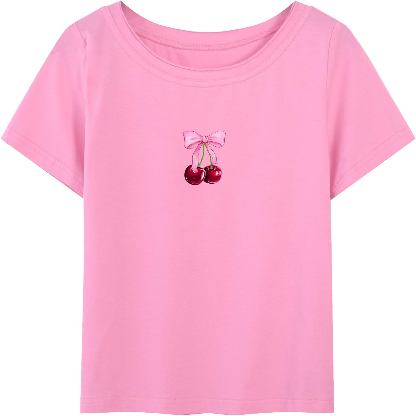 Girls Graphic Tees Crewneck Short Sleeve Shirt Bow Cheery Cute Summer Tops