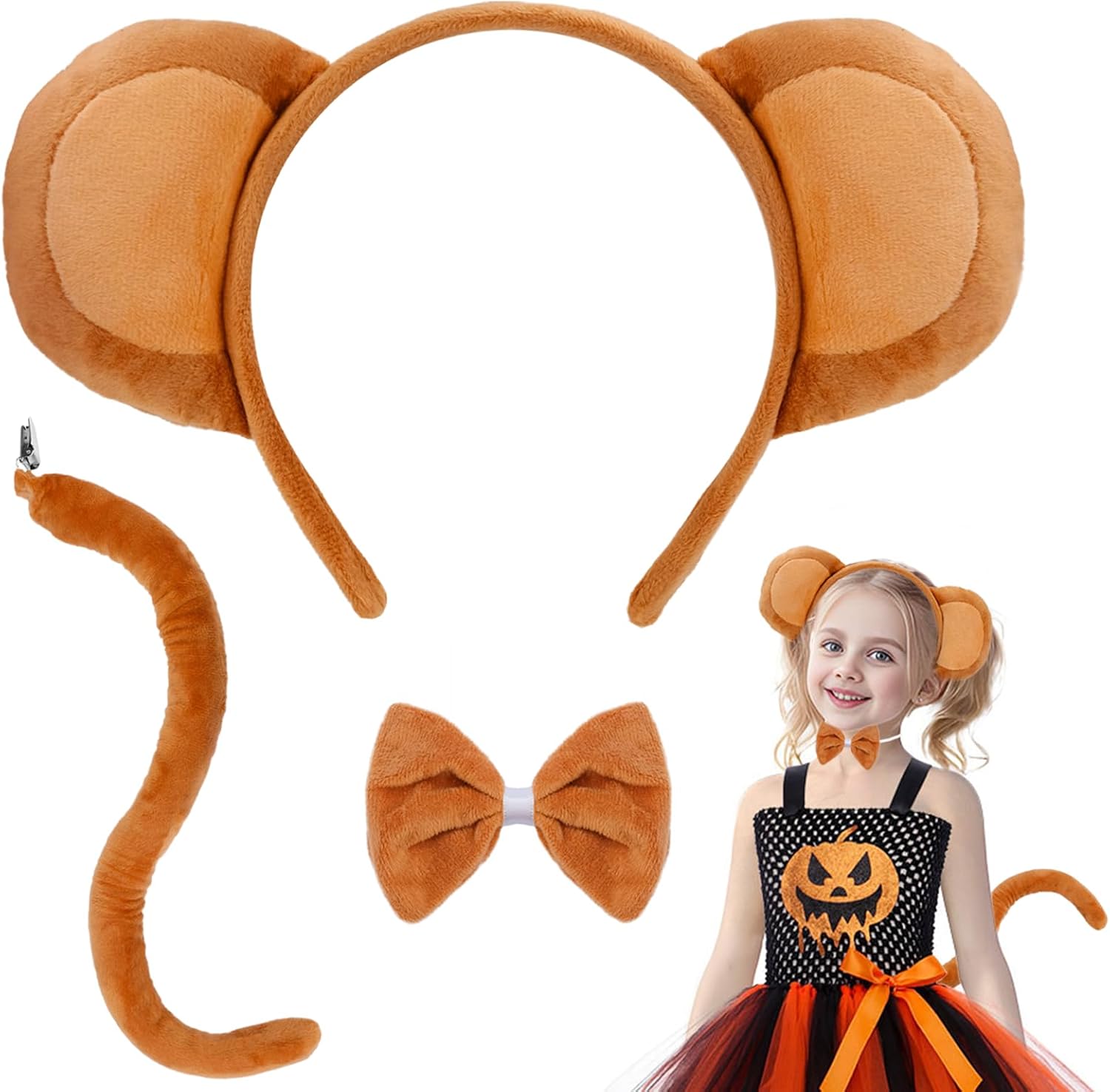 SIOTMERA Monkey Costume Set-3 Pieces Brown Monkey Ears and Tail Set with Headband, Bow tie and Tail -Fancy Animal Cosplay Accessories for Cosplay Party Halloween Birthday Christmas