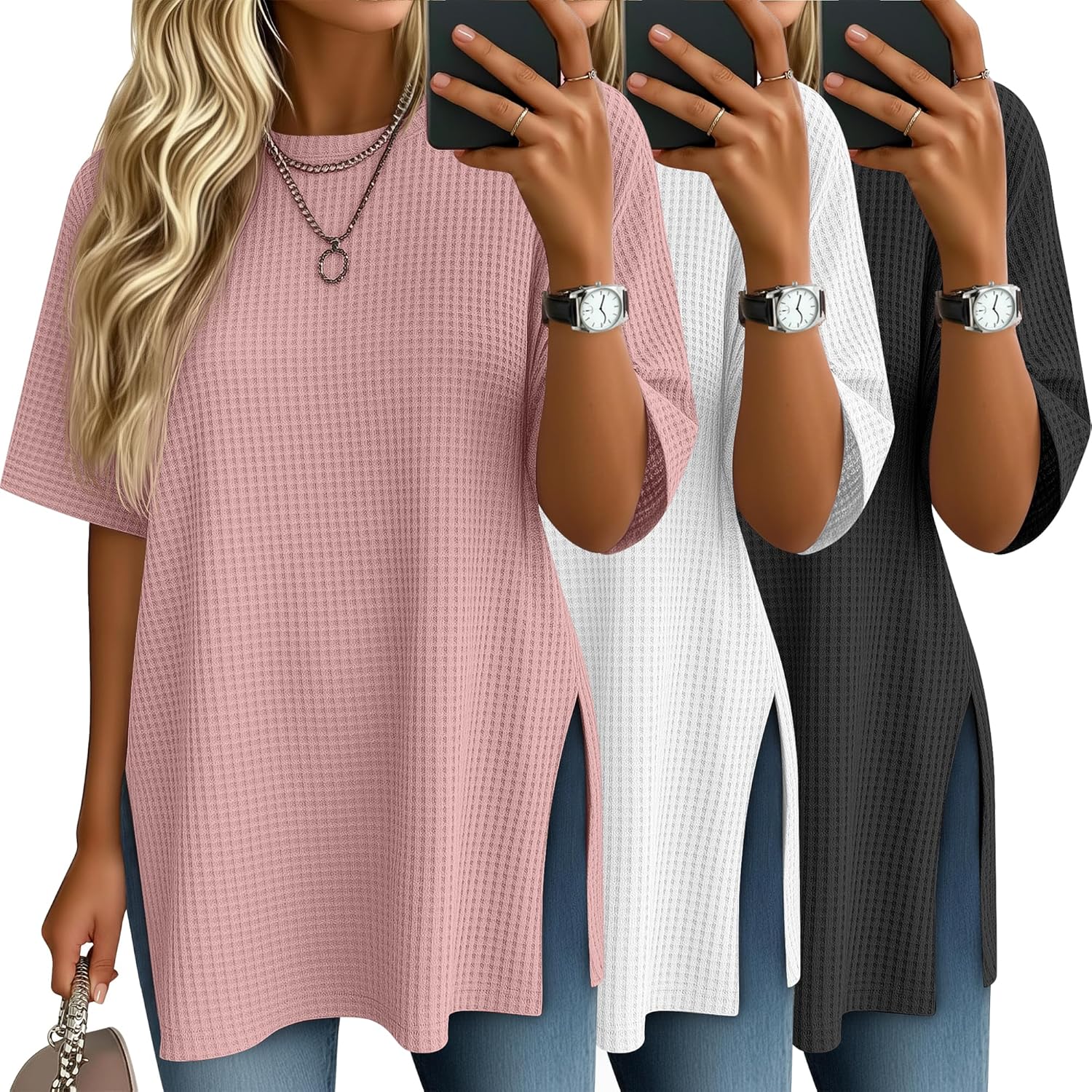 3 Pack Women's Oversize Short Sleeve Tops Waffle Knit Crewneck T-Shirts Summer Casual Side Split Tees(Black, White, Gray Pink,XX-Large)
