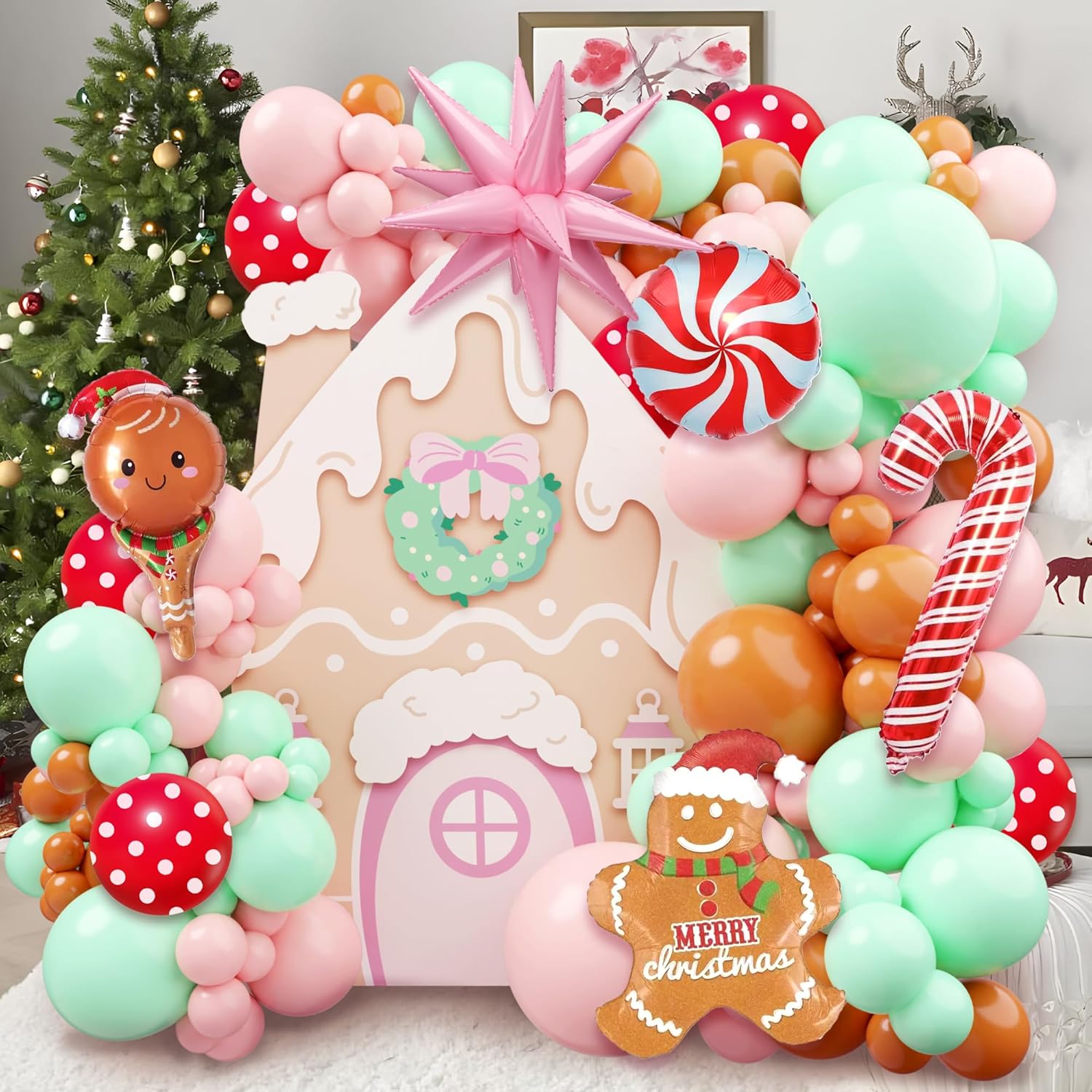 Christmas Gingerbread Balloon Arch Kit,184 Pcs Pink and Green Xmas Balloon Garland Arch with Cookie Figure, Candy and Snowman Balloons for Christmas Party Decorations, Xmas Holiday Event Supplies