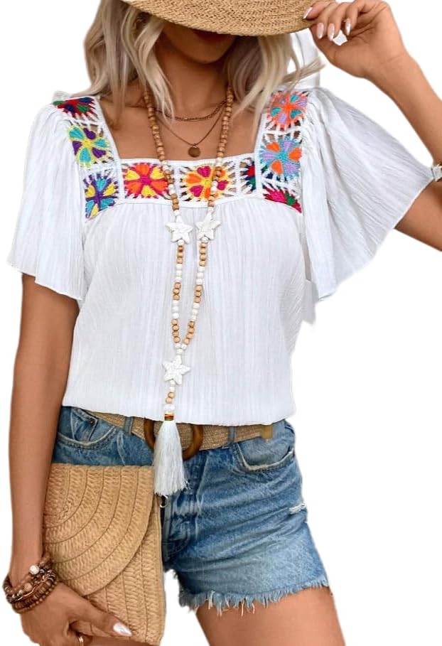 Melliflo Womens Summer Boho Floral Crochet Ruffle Short Sleeve Shirts Hollow Out Square Neck Tops Dressy Casual Blouse