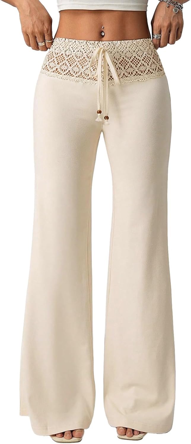 EVALESS Womens Wide Leg Pants Lace Elastic High Waisted Palazzo Pants Bell Bottoms Flowy Boho Holiday Trousers