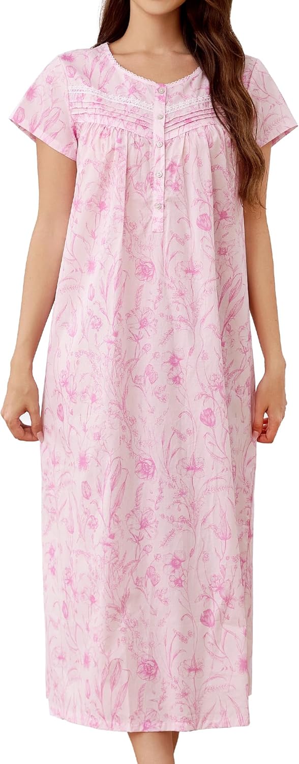 FMIRREO Women's Long Nightgowns Cotton Night Gowns for Adult Women Short Sleeves Sleepwear Lightweight House Dresses