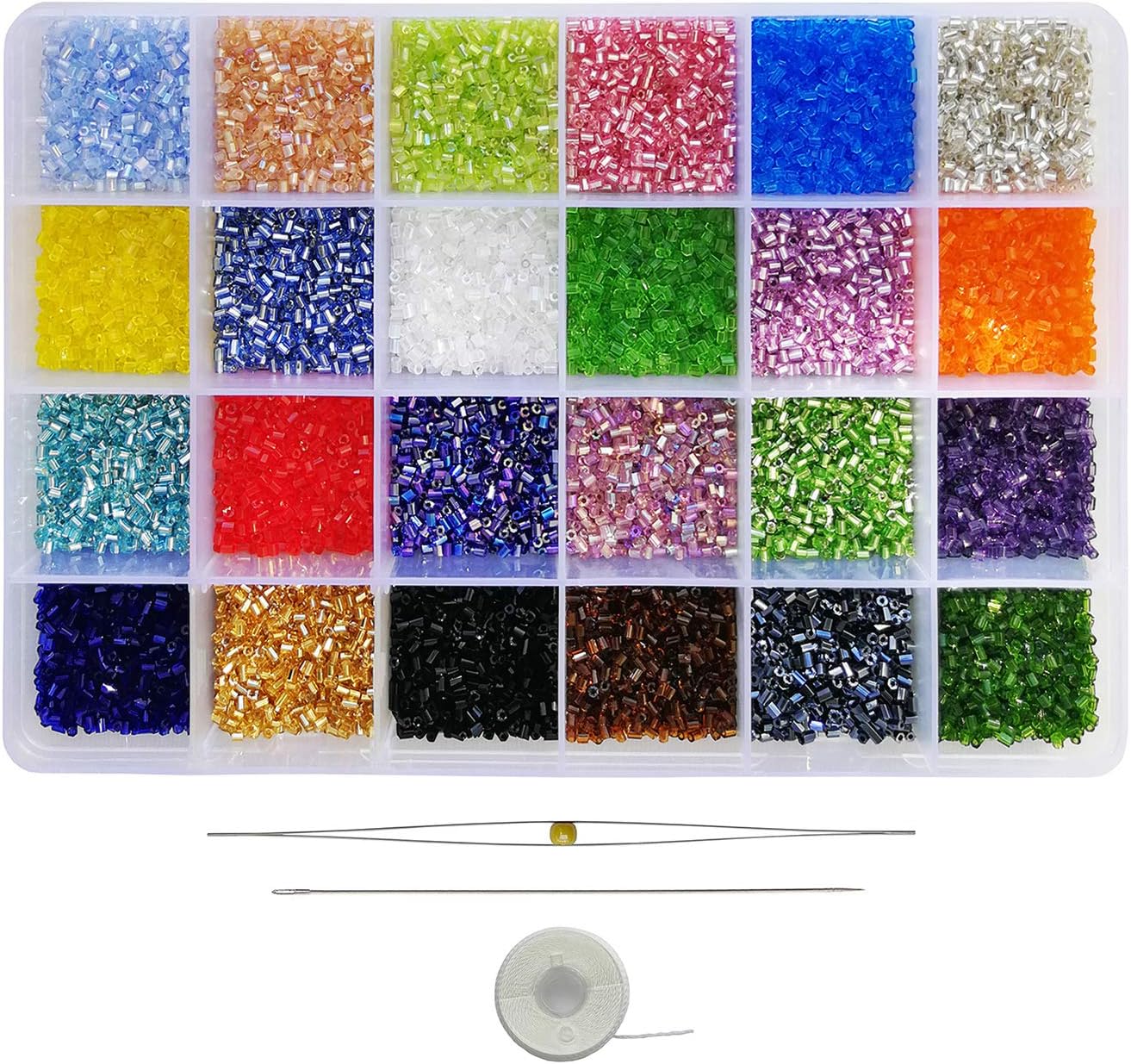 - Quantity: about 900pcs/color, 24 Colors, Total 21600pcs; Storage Box size: 20x13x2.3cm; Including 2 pcs Beading Needles; 1 roll non elastic beading thread