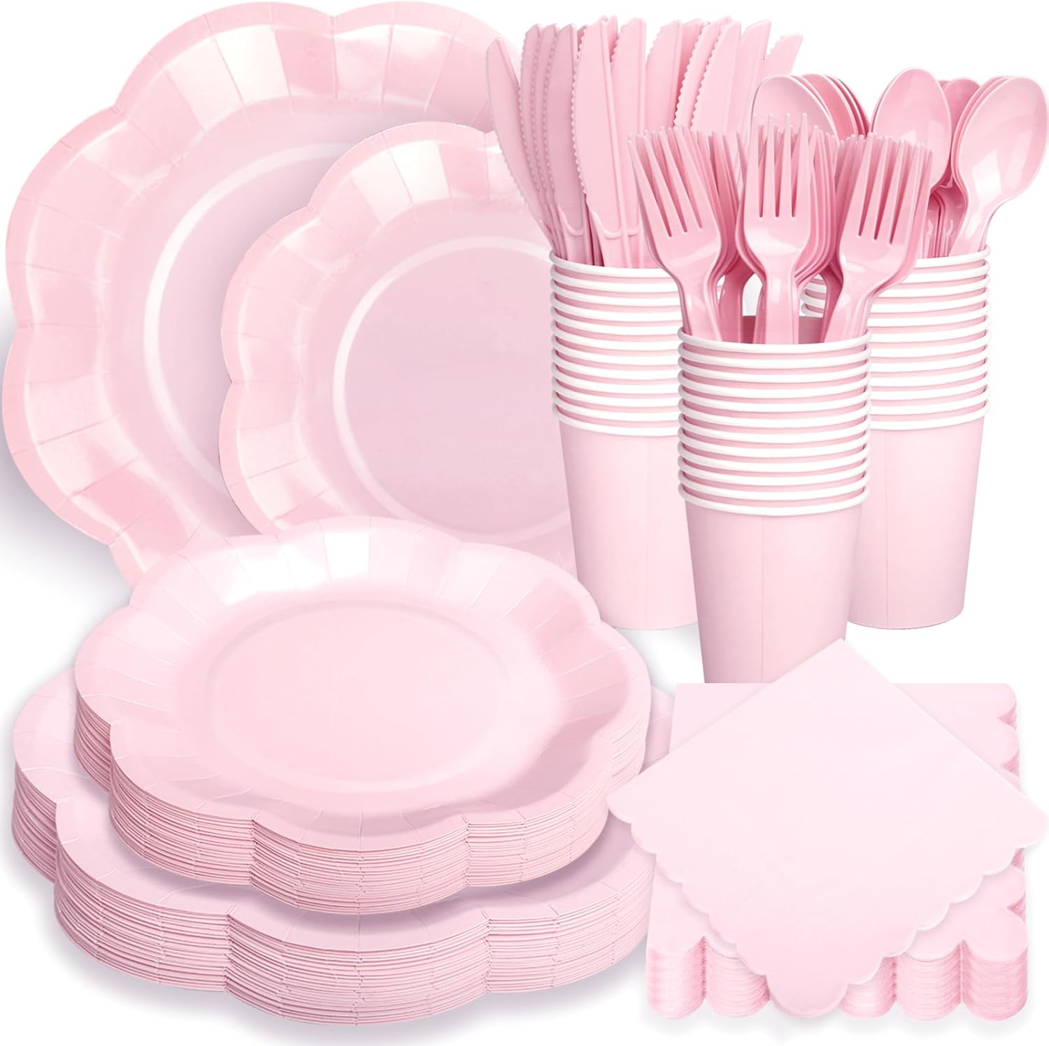 - In The Box: There Are 24 Pieces Of 9 Inch Pink Disposable Scalloped Plates, 24 Pieces Of 7 Inch Pink Plates,48 Pieces Of Pink Cocktail Napkins With Scalloped Edge, 24 Pieces Pink 9OZ Paper Cups, 24 Sets Of Sturdy Plastic Knife/Fork/Spoon, 192 Pieces In Total Can Well Meeting Your Different Party Needs.