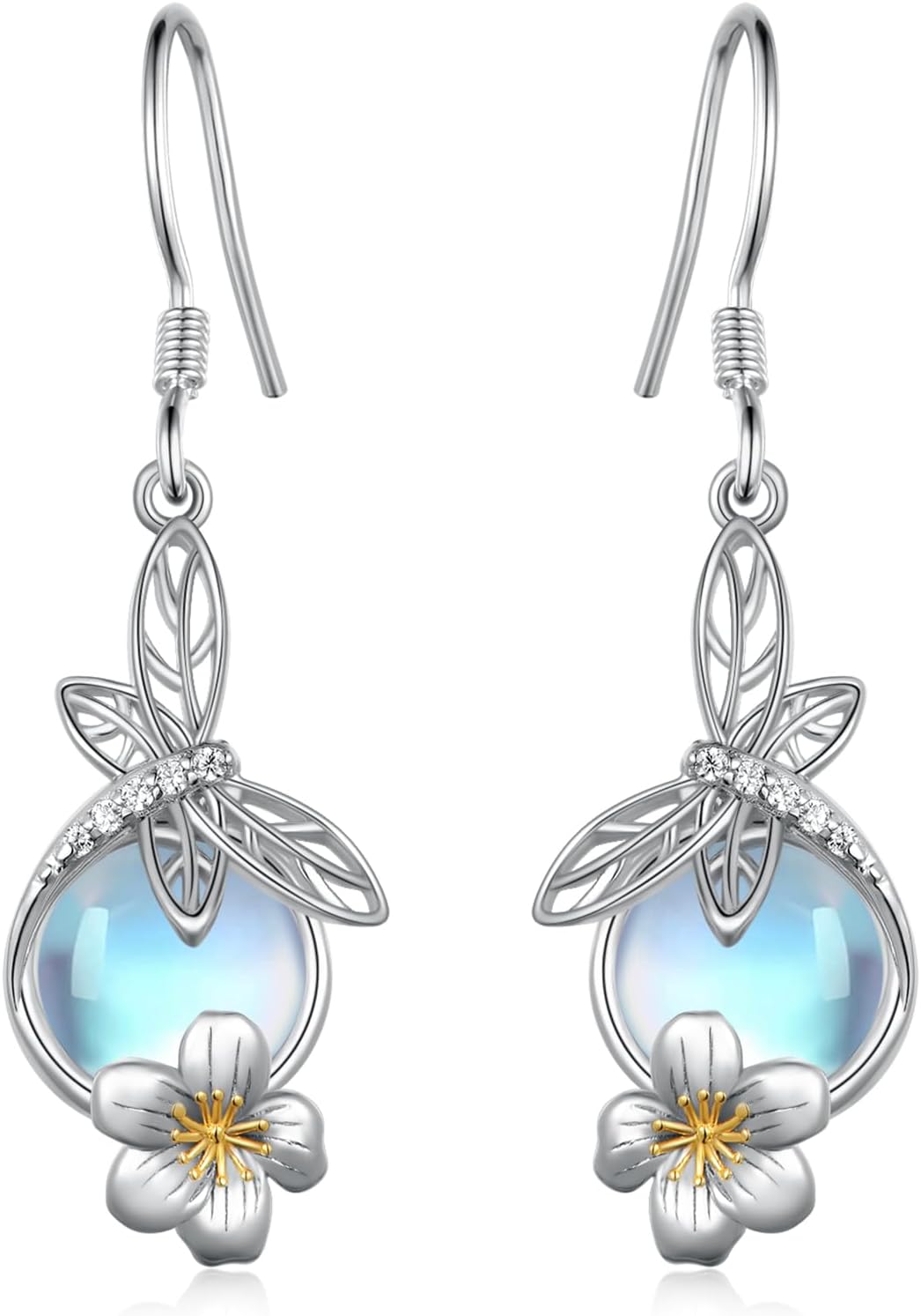 Dragonfly Earrings 925 Sterling Silver Dragonfly Moonstone Flowers Dangle Earrings Jewelry Gift for Women