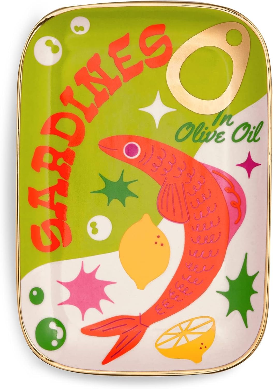 - DESIGN: These sardines want to hold your rings and keys; this ceramic trinket dish with metallic gold details is inspired by a can of sardines and serves as the perfect catch all for everything from jewelry to after dinner mints