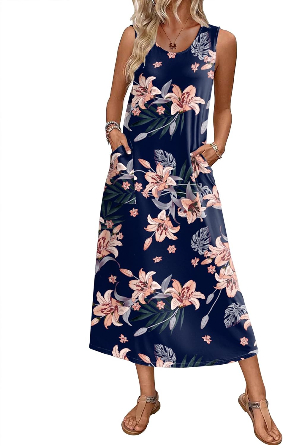 Ekouaer Nightgowns for Women Sleeveless Sleepshirt Long Print House Dress Tank Nightshirt Maxi Casual Dress with Pockets