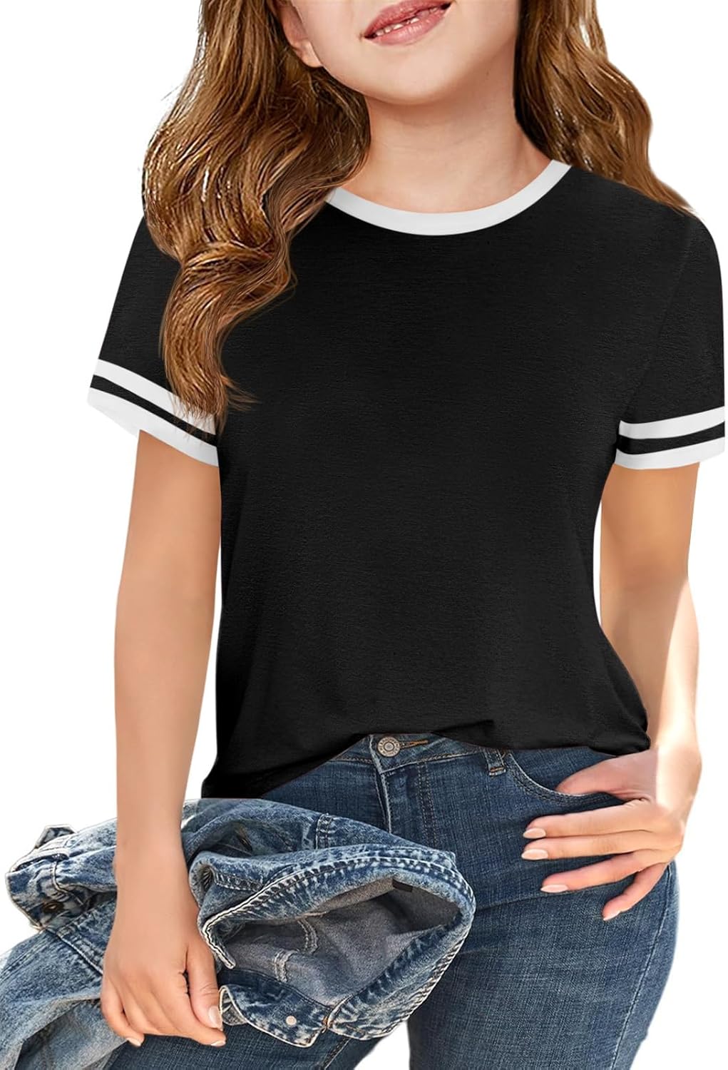 Haloumoning Girls Short Sleeve T Shirts Kids Summer Crewneck Color Block Tops Fashion Tees 5-14 Years