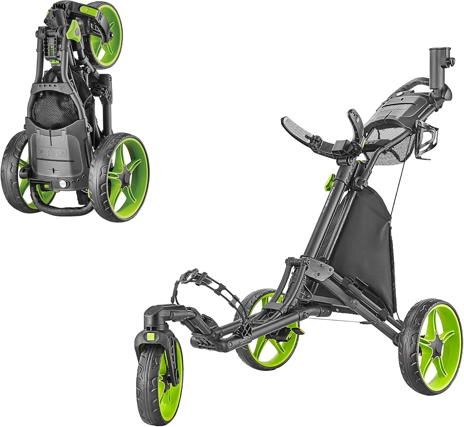 - ONE-CLICK FOLDING & PORTABILITY: This lightweight golf push cart has a patented one-button folding system that opens and collapses in seconds. Compact, portable, and travel-ready foldable golf push cart for effortless storage and transport.