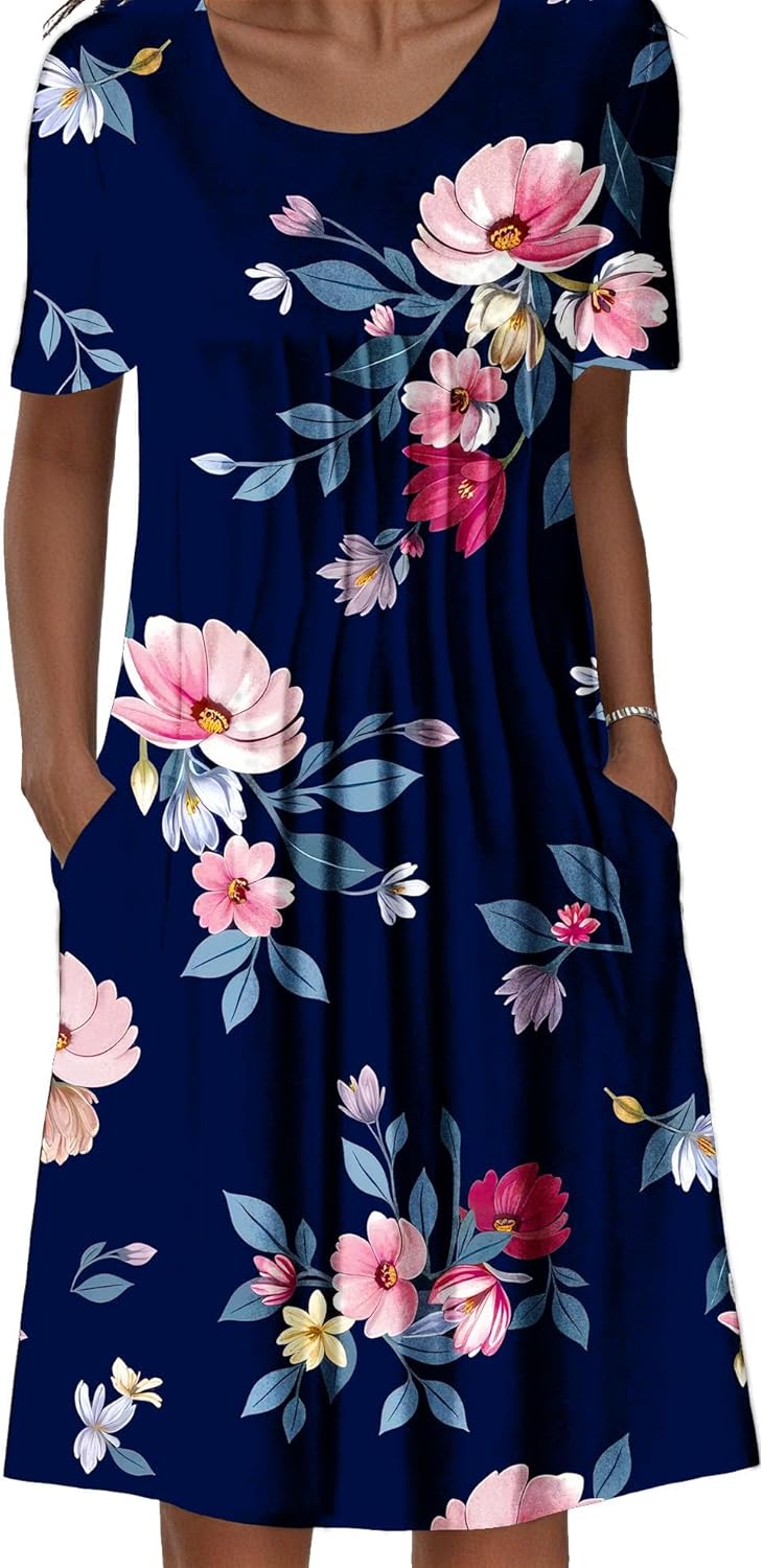 Size M Summer Dresses for Women 2026 Casual Short Sleeve Knee Length T-Shirt Dress Swing Flowy Loose Fit A Line Boho Midi Dress with Pockets Navy Blue Floral