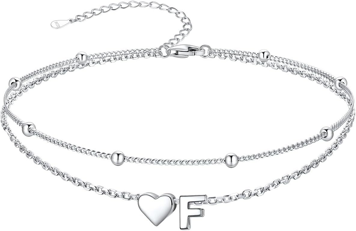 SILVERCUTE Silver Anklets for Women, Waterproof Initial Heart Ankle Bracelets Sterling Silver, Adjustable Layered Foot Jewelry Summer Beach Fashion with Personalized Name Design, Gift Package