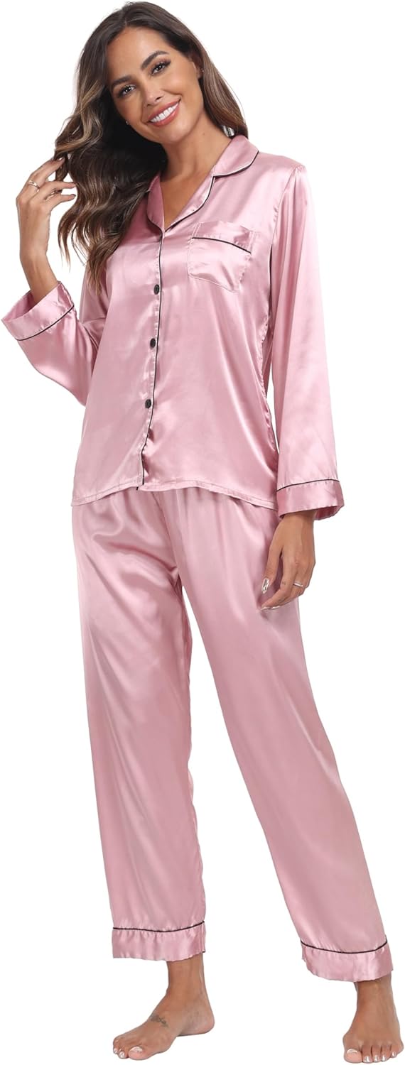 Super Shopping-zone Women's Satin Pajama Set Long Sleeve Pajamas Button Down Pjs Set Silky Sleep Set Sleepwear Loungewear