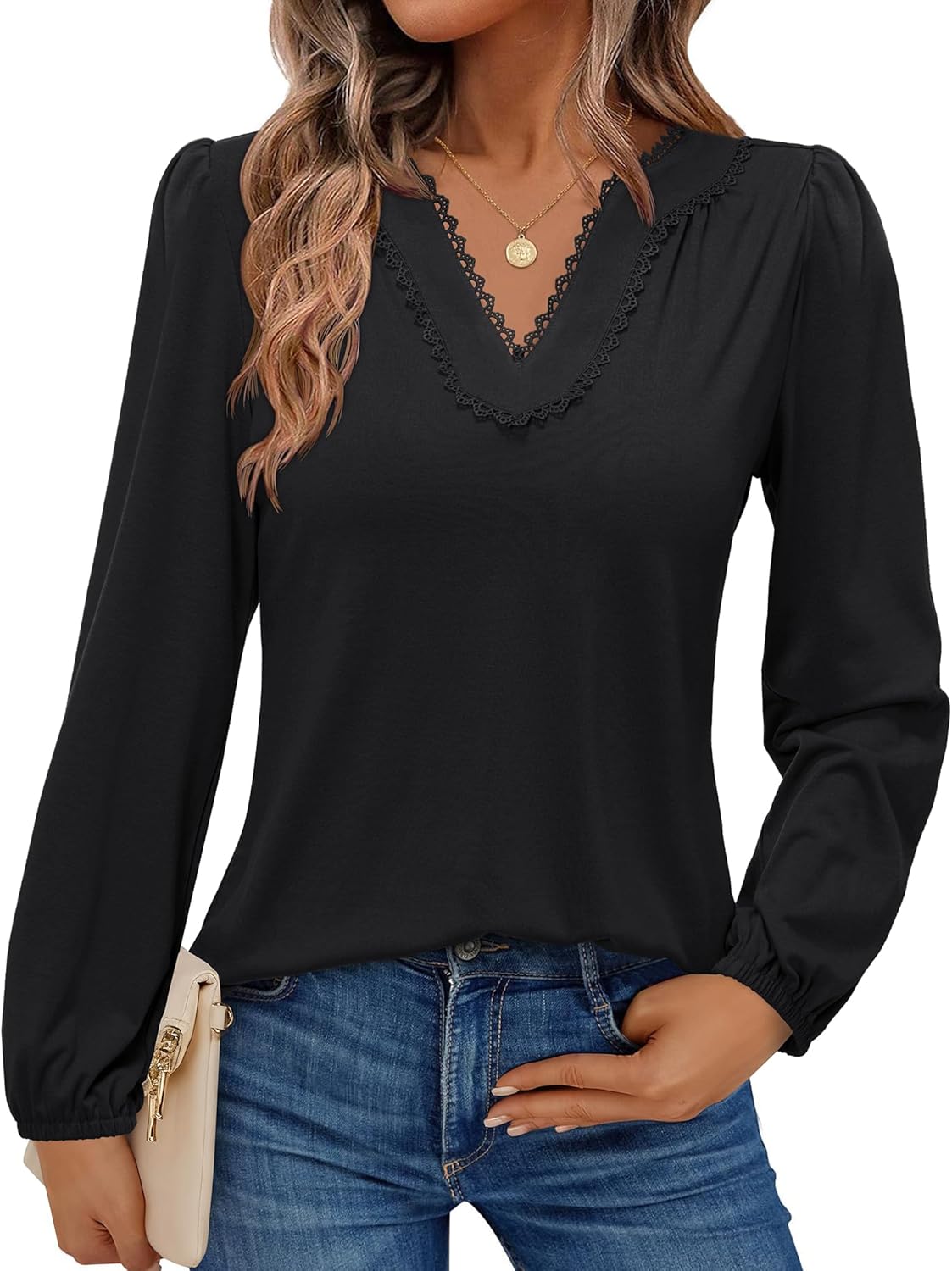 siliteelon Long Sleeve Blouses for Women Dressy Casual Tops for Women Trendy V Neck Lantern Long Sleeve Lace Trim 2026 Spring