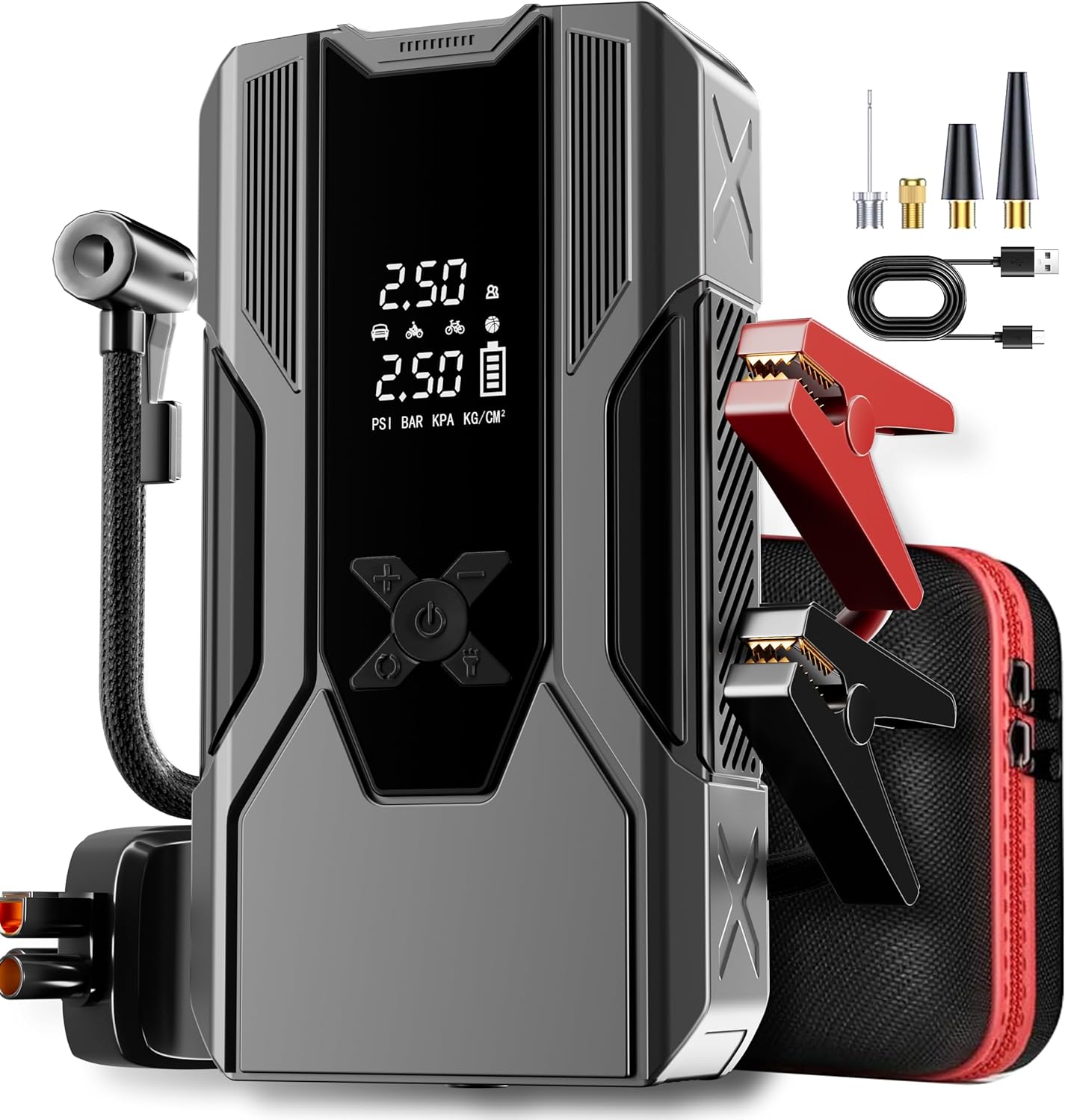 - 【Integrated 150PSI Tire Inflator】: Rapidly inflate car tires, bikes, sports balls, and more with the built-in digital air compressor. Easily set your desired pressure (PSI/BAR/KPA) on the clear LCD screen; it auto-shuts off when reached. Tackle low tires anytime, anywhere.