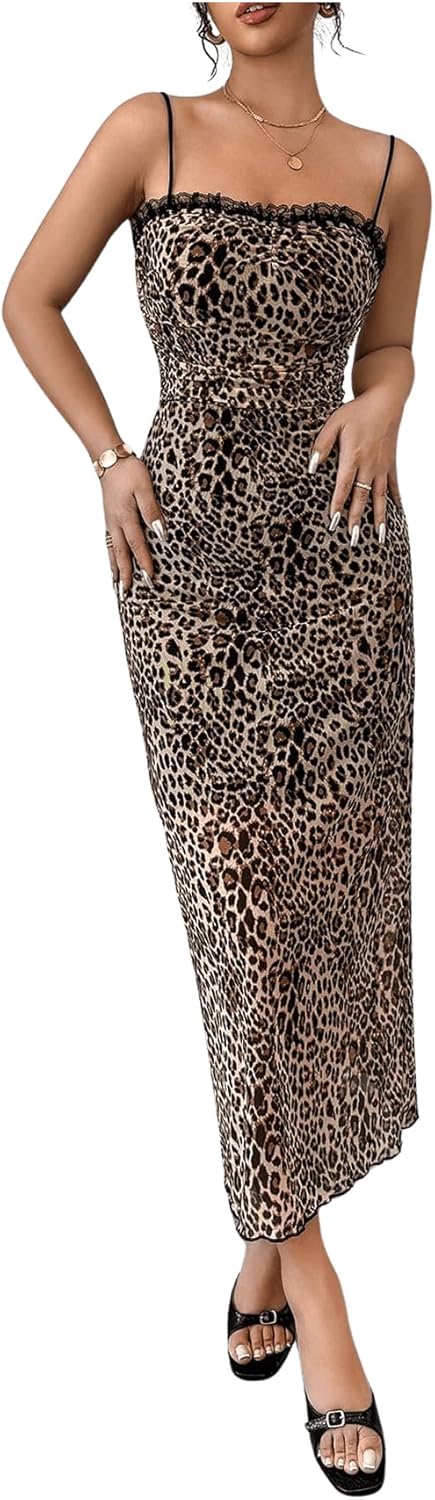 Floerns Women's Leopard Print Slip Dress Lace Trim Sleeveless Party Bodycon Long Dresses