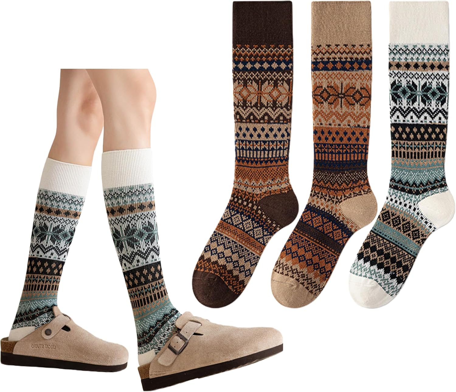 3 Pairs Women Retro Calf Socks - Classic Knit Pattern Slouch Color Block Warm Cozy for Daily Casual/Workout