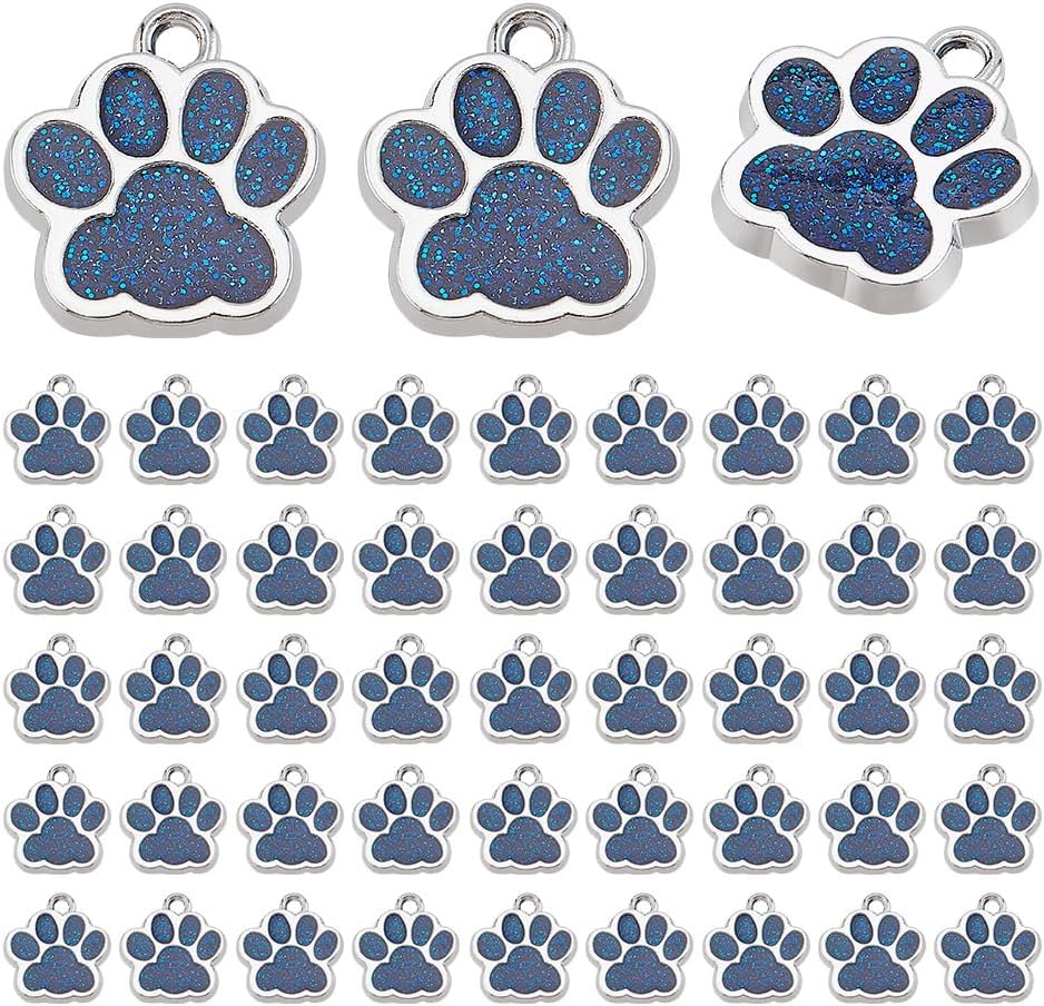 50 Pcs Enamel Dog Paw Print Charms, Alloy Puppy Paw Charms Blue Glitter Footprint Beads Charm for DIY Jewelry Making