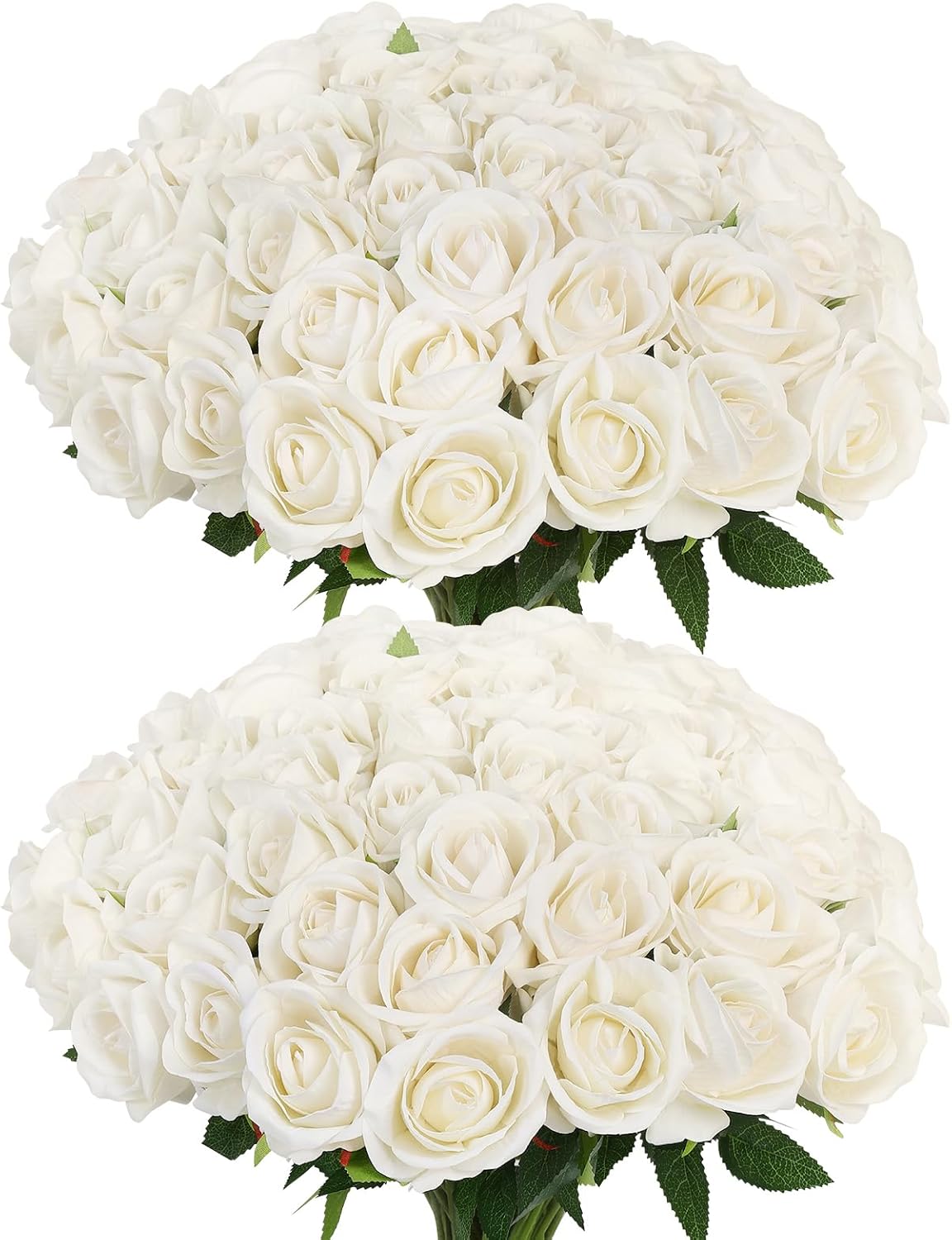 LFF 50 Pcs Realistic White Artificial Roses - Premium Velvet Faux Flowers for Wedding Bouquet, Centerpieces, Home & Party Decoration(White)