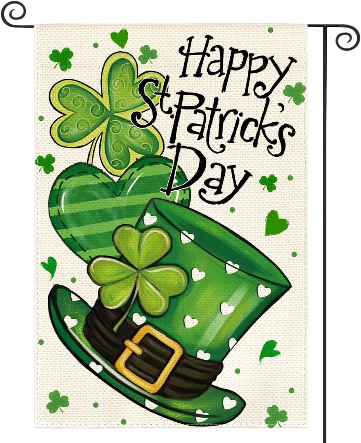 AVOIN colorlife Happy St Patricks Day Garden Flag 12x18 Inch Double Sided Outside, Shamrock Lucky Clover Hat Yard Outdoor Flag