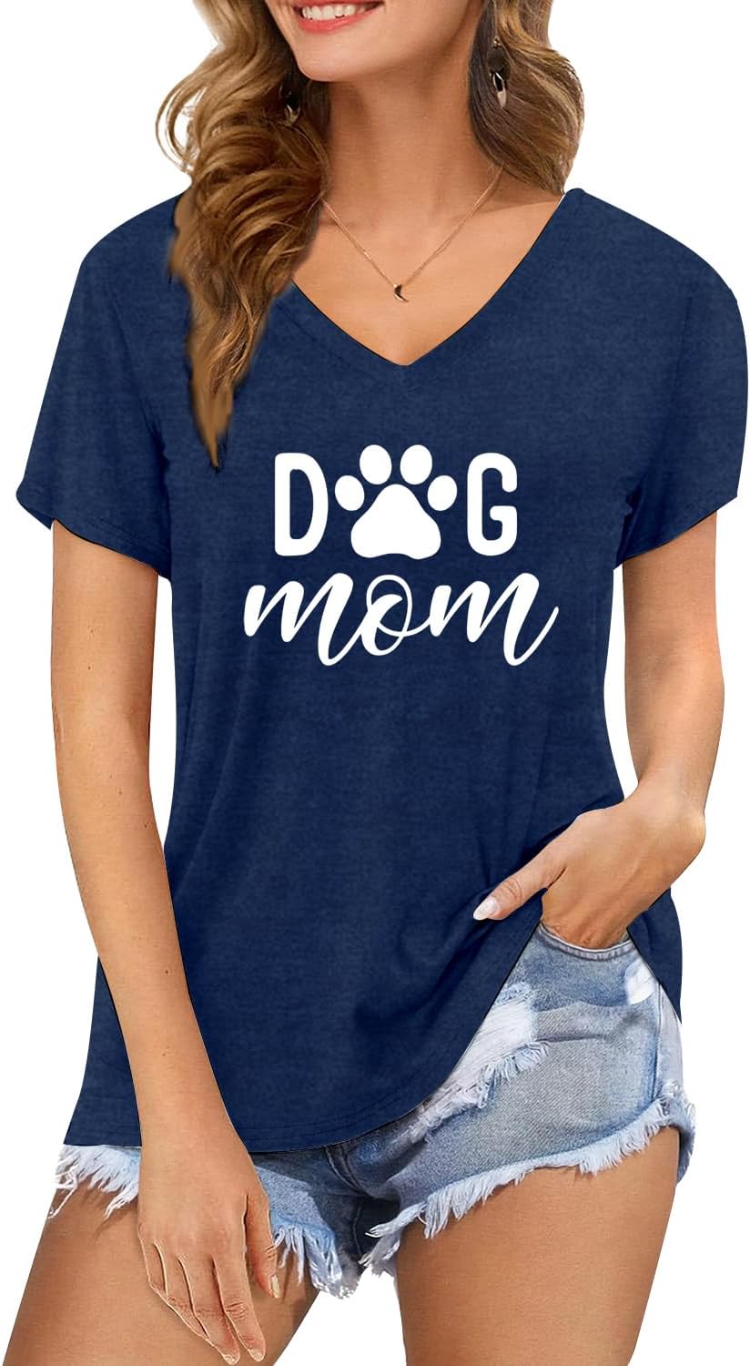 Dog Mom Shirts for Women Dog Paw Printed Mom T-Shirt V Neck Paw Lovers Tee Tops