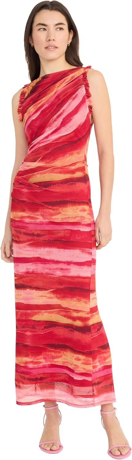 Donna Morgan Womens Women's Asymmetrical Neckline Ruched Fitted Maxi - Sleeveless Ruffle Evening Formal Wedding Guest Dress