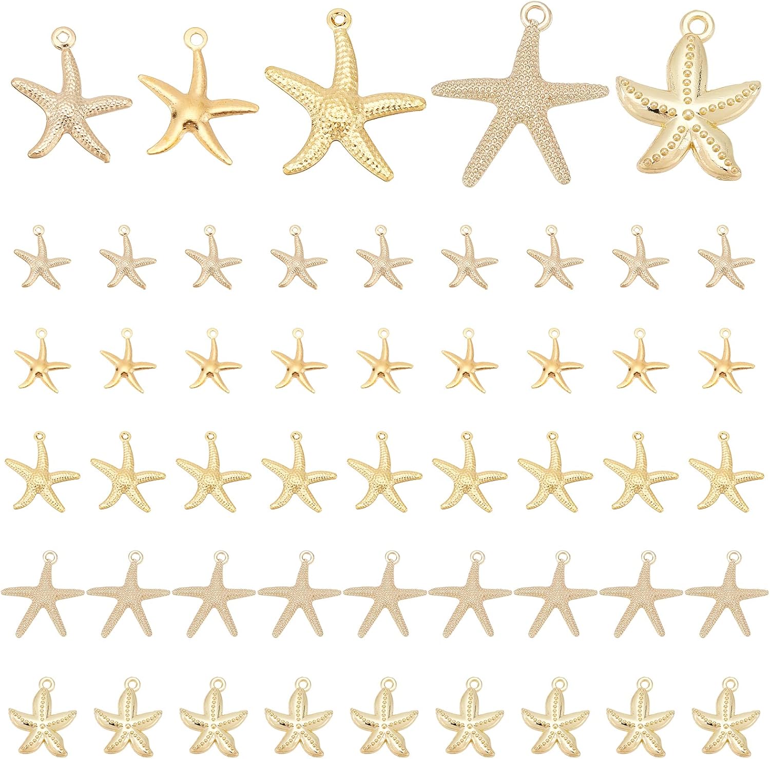 PH PandaHall 50pcs Metal Starfish Pendants, 5 Styles Sea Star Fish Charms Ocean Theme Charms Golden Sea Animal Pendans for Summer Hawaii Necklace Bracelet Earring Jewelry Making