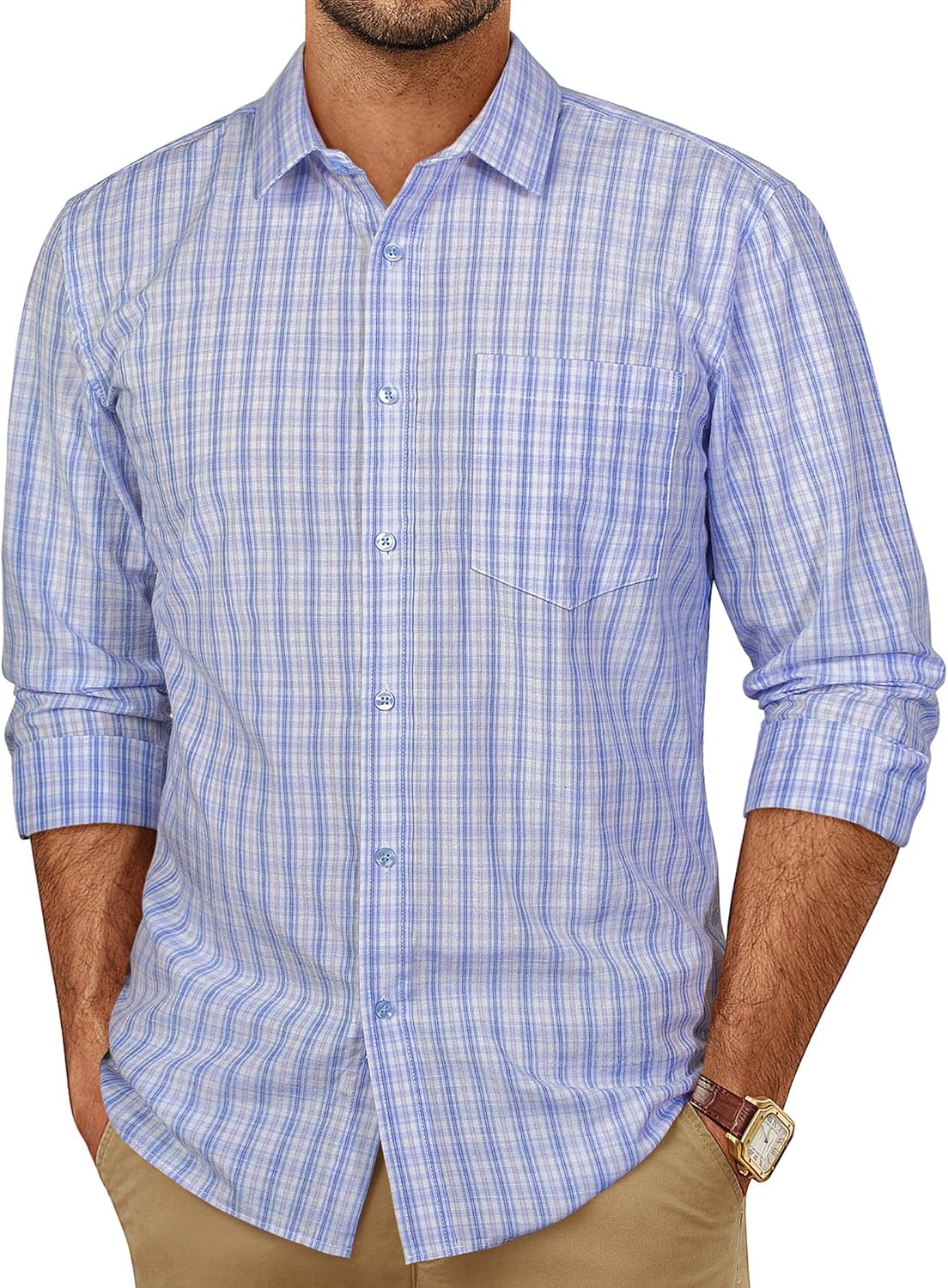 PJ PAUL JONES Mens Dress Shirts Cotton Long Sleeve Button Down Shirts Business Casual Plaid Tops with Pocket