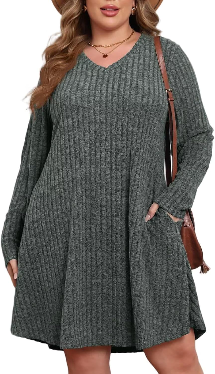 BELAROI Plus Size Sweater Dress for Women Tshirt Fall Dresses Winter V Neck Long Sleeve Pockets Casual Party Loose Fit