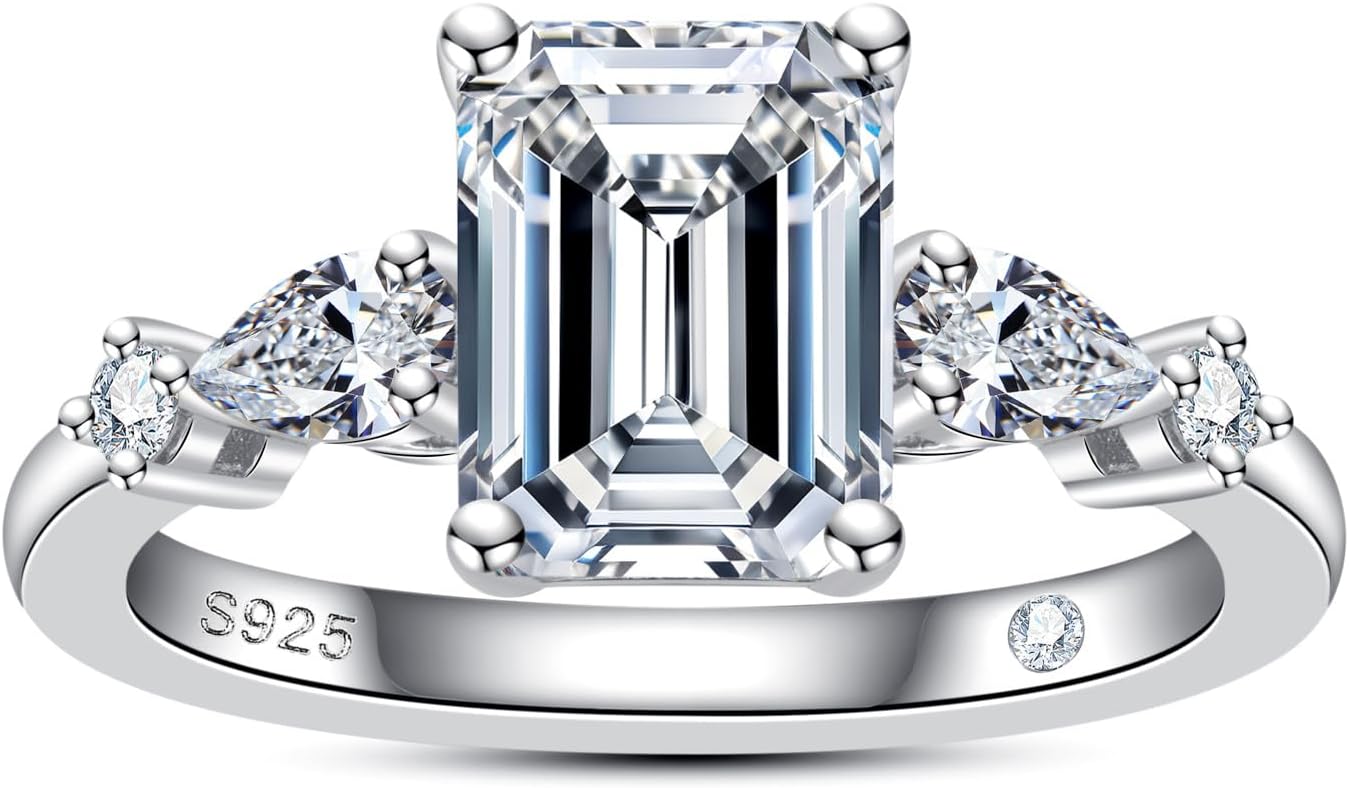 AnuClub Emerald/Radiant Cut Moissanite Engagement Rings 3CT Center Stone D Color VVS1 925 Sterling Silver Pear Cut Side Stone Wedding Promise Anniversary Ring for Women With Certificate