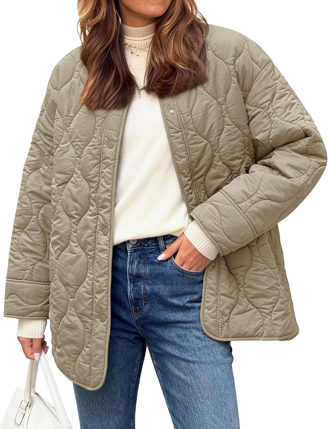Flygo Women's Oversized Quilted Lightweight Jacket Button Down Puffer Padded Outerwear with Pocket(Khaki-M)