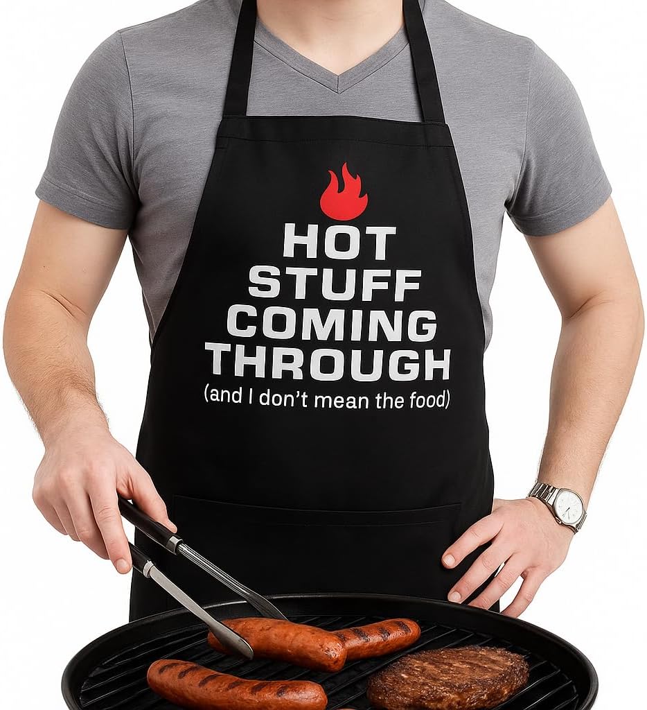 AMORII , Funny Apron for Men Waterproff cooking apron for Men. Adjustable BBQ Apron. With 2 Large Pockets Chef Apron. Hot stuff coming through, Black, colorsize