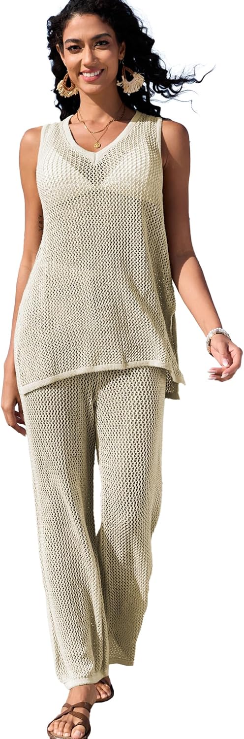 Famulily Womens 2 Piece Crochet Knit Outfits Summer Hollow Out Cover Up Sets Sleeveless Deep V Neck Top and Wide Leg Pants