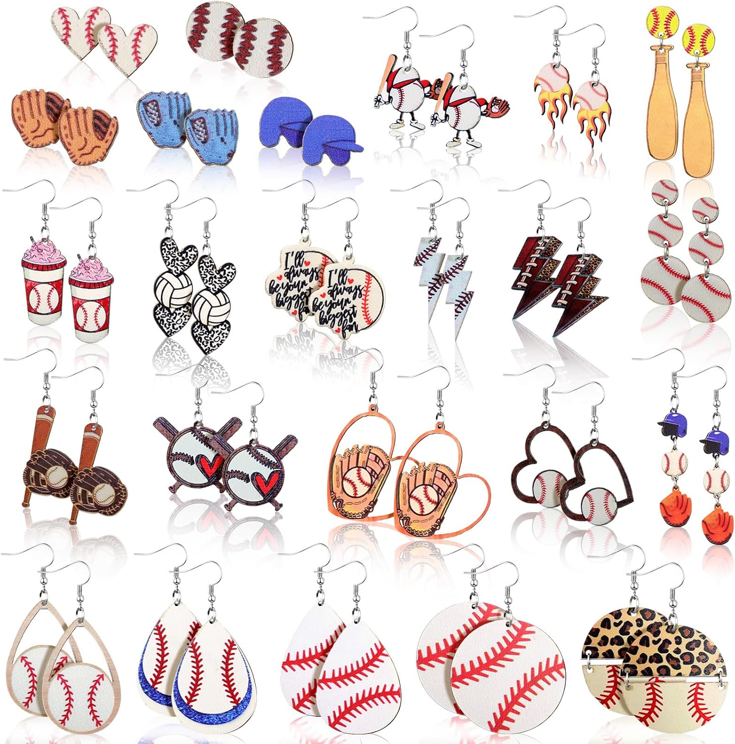 Landical 24 Pairs Baseball Earrings for Women Baseball Drop Dangle Earrings Sports Earrings Wooden Stud Jewelry Gifts for Women Party