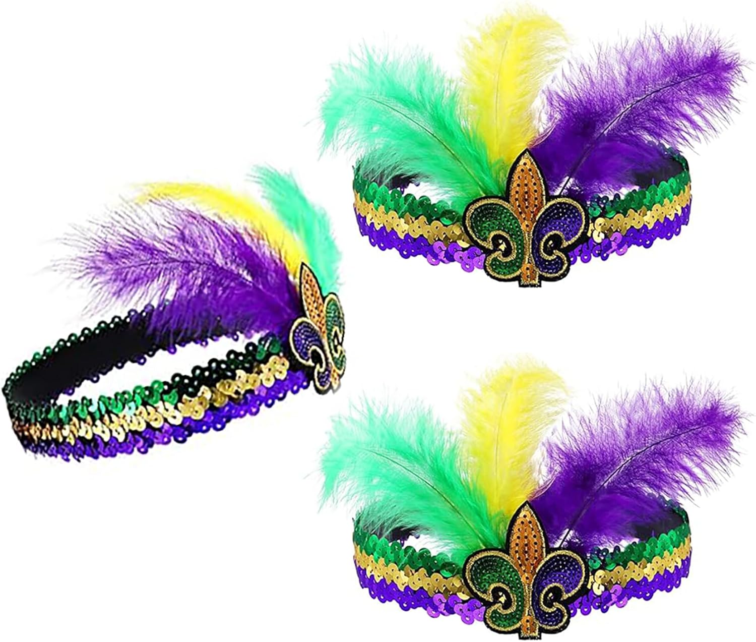 WOVOWOVO 3 Packs Mardi Gras Headband Glitter Sequin Mardi Gras Headbands for Women Feather Hair Accessories Head Band Headpiece Outfit Masquerade Mask Party Decoration Favors Purple Cocktail Headwear