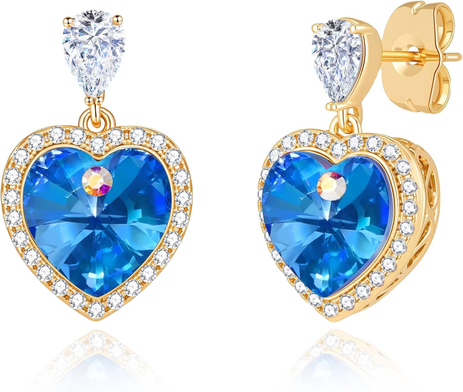 Trendy Austrian Crystal Heart Halo Drop Stud Earrings for Women 14K Gold Plated Dangle Earring Hypoallergenic Jewelry Gift