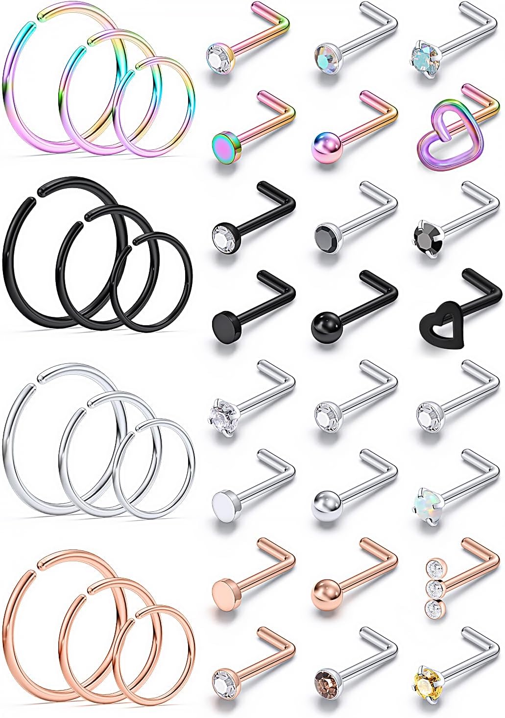 18G 20G 22G Nose Ring Studs Surgical Steel L Shaped Nose Studs Nose Rings Hoop Diamond Heart Cute Hypoallergenic Nostril Piercing Jewelry Silver Rose Gold Black Rainbow Nose Jewelry