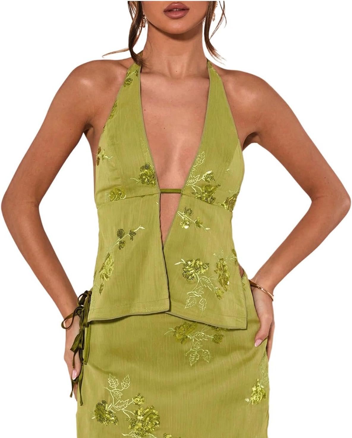 SOLY HUX Women's Floral Print Halter Backless Vintage Camisole Crop Tops Summer Beach Vacation Cute Tops