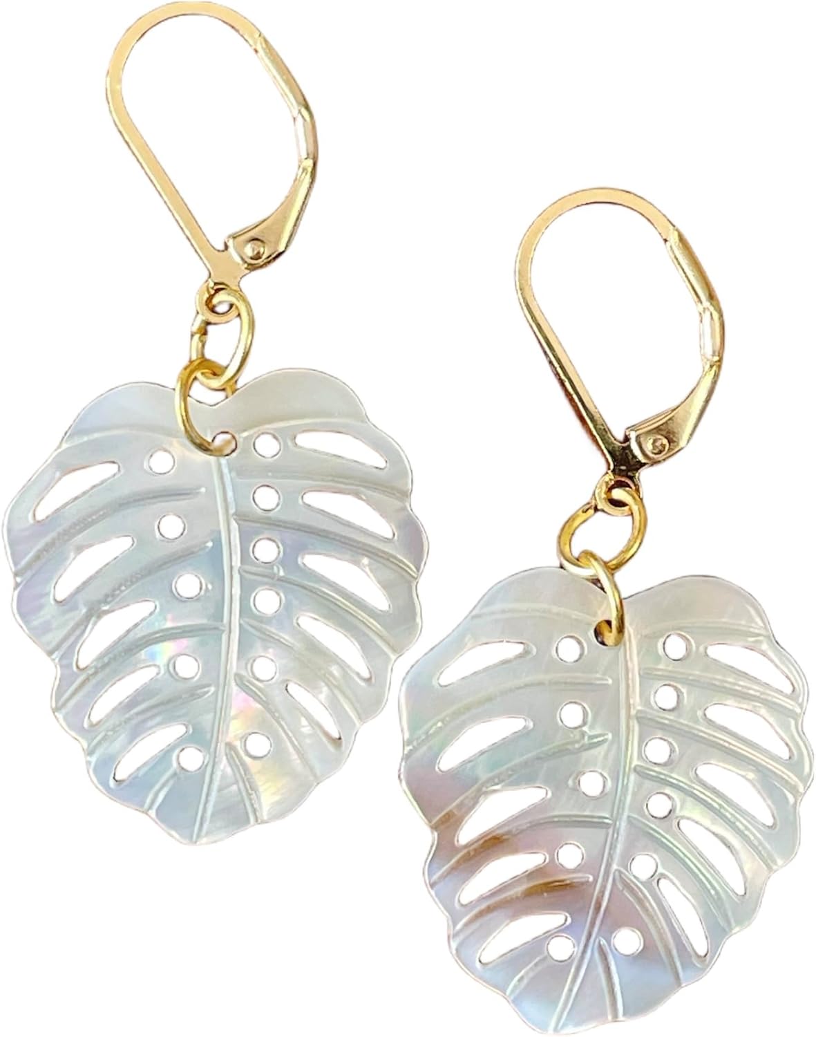 Mother of Pearl Monstera Earrings, Natural Sea Shell Tropical Leaf Earrings, Small Gold Plated Drop Dangle Leverback, Trendy Women Girl Gift