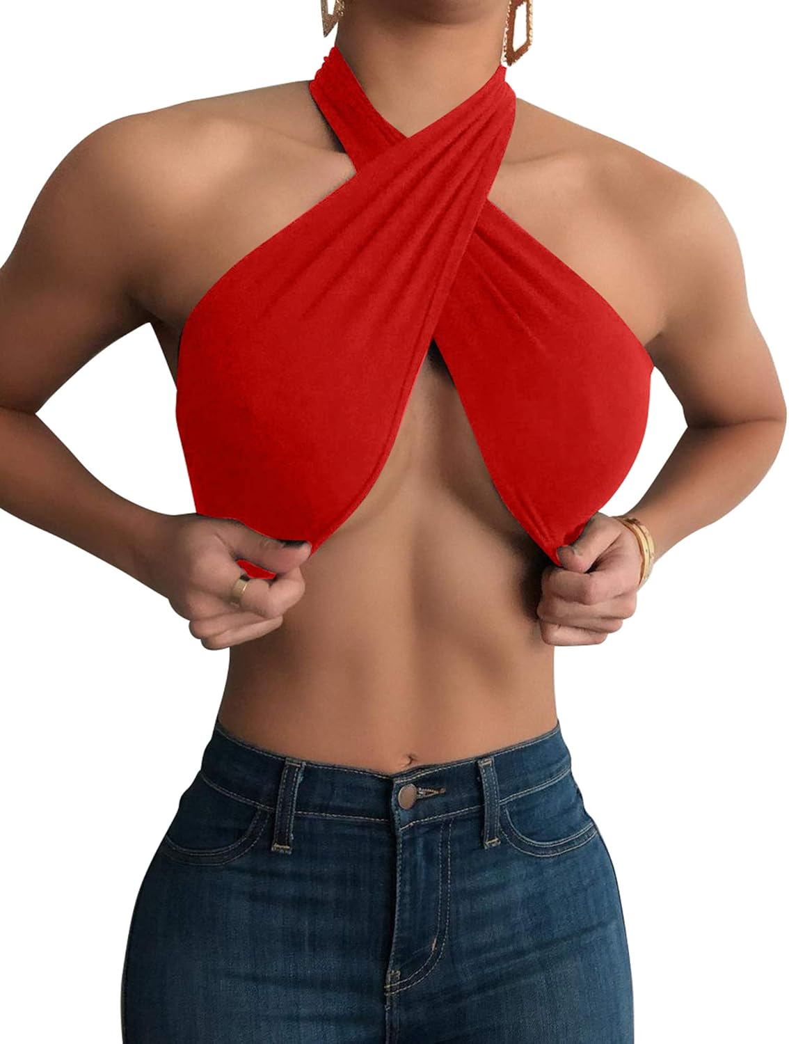 Mokoru Women's Sexy Sleeveless Halter Criss Cross Tank Crop Tops Self Tie Backless Cami