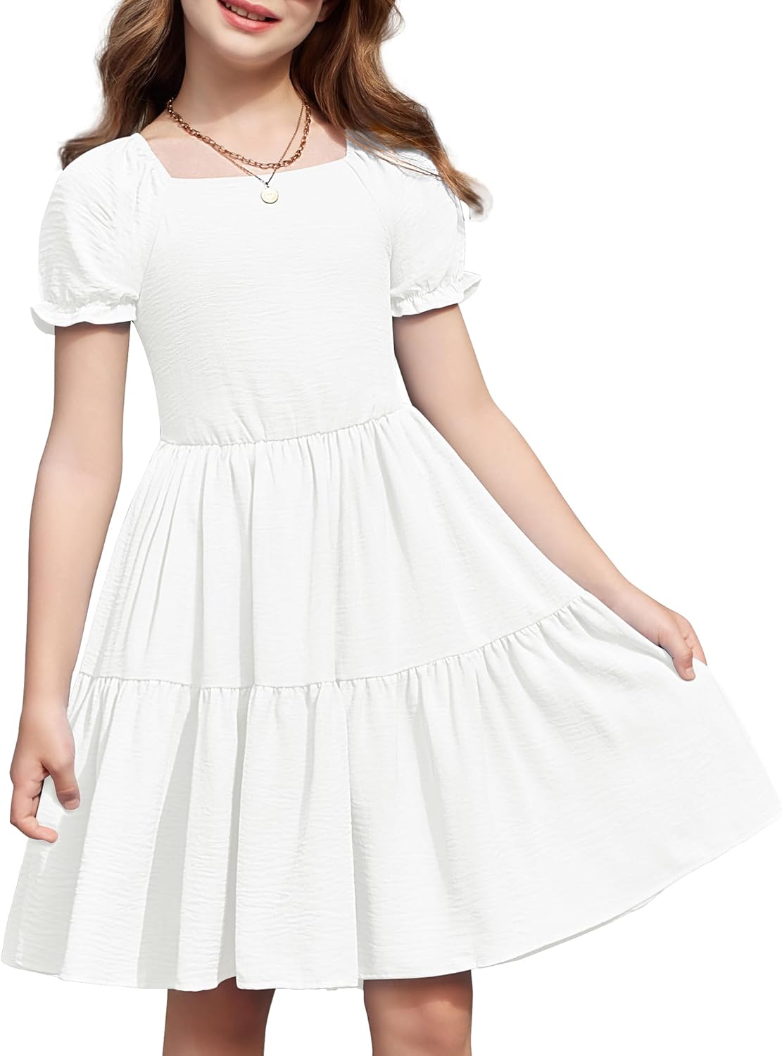Arshiner Girls Summer Dress Tie Back Short Sleeve Square Neck Tiered Midi Casual Dresses with Pockets