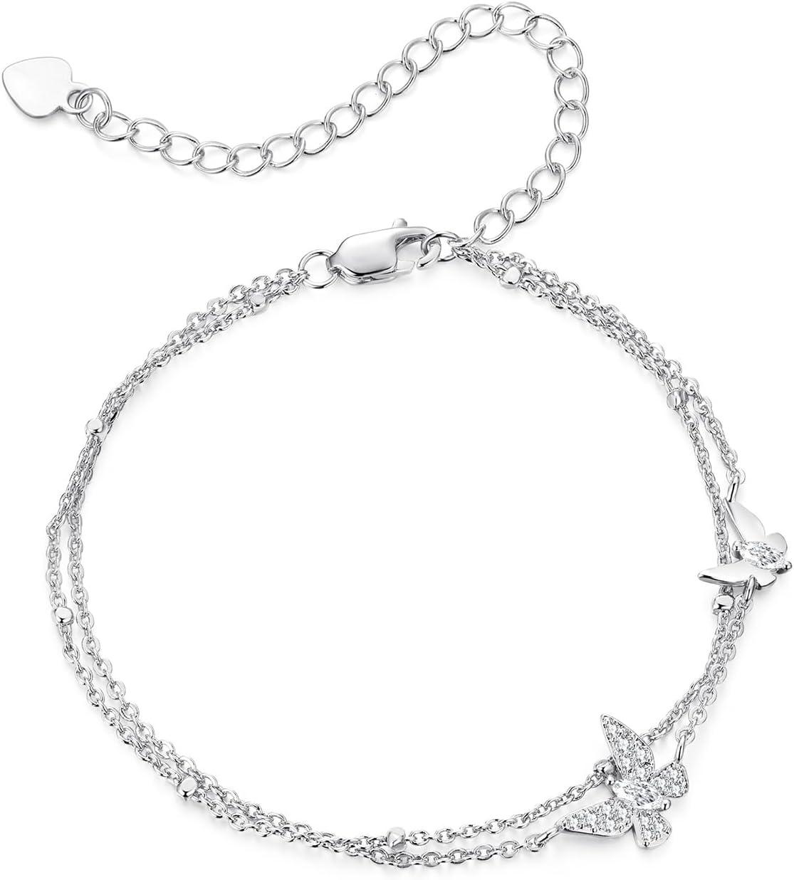 Silver Plated Love Heart Butterfly Bracelets For Women 14K Gold Plated Double Layers Valentines Gift Charms Bracelet Hypoallergenic Jewelry
