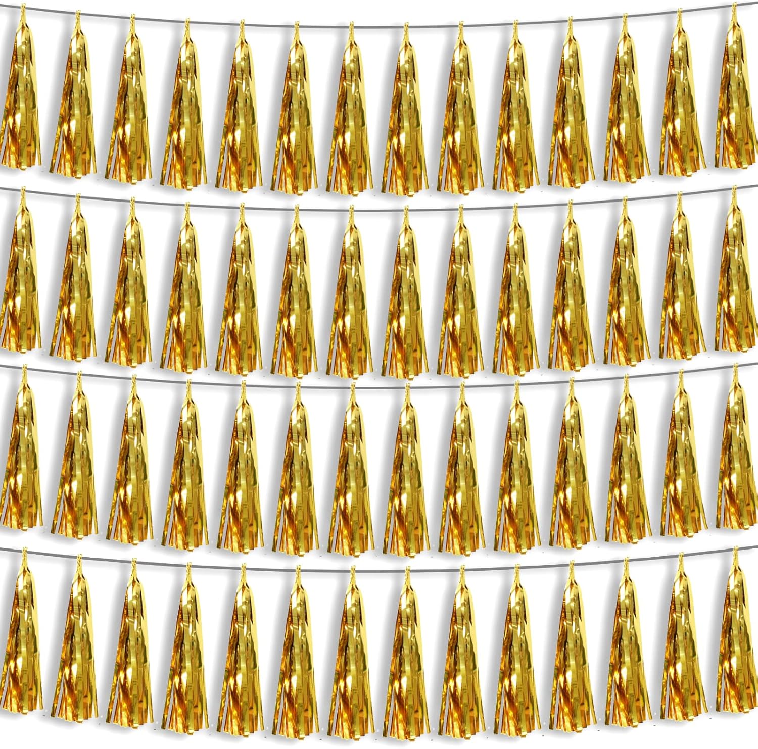 - 【Reusable Tassel Garland Material】: high-quality metallic foil tassel garlands, with the virtue of nice craftsmanship and lightweight, they are reusable and safe, and not easy to fade; They come with white ribbon for hanging, and garland tassels hang perpendicular to the string, and are adjustable to provide you with the option of spreading the tassels out or piecing them closer together.