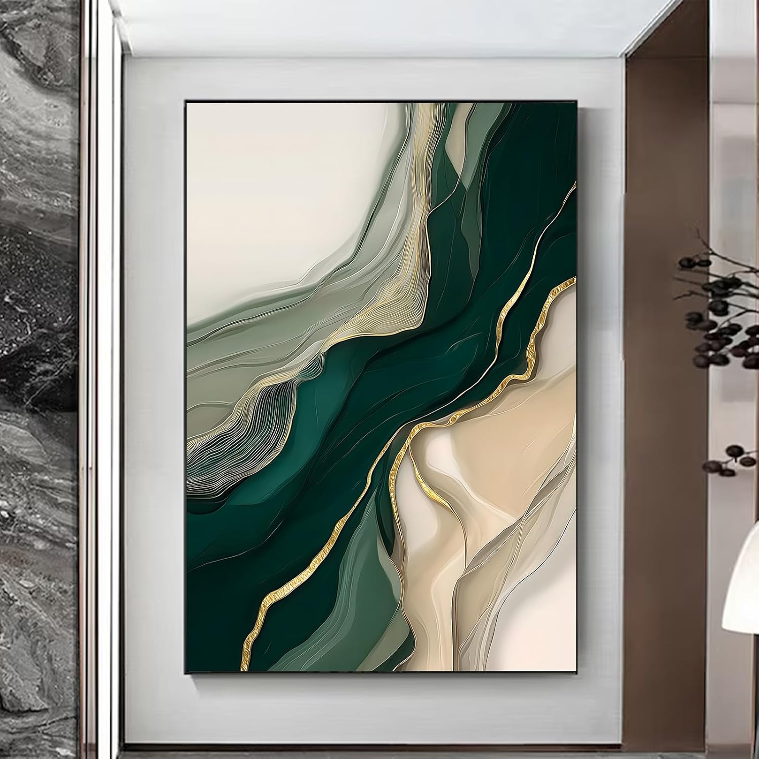 Green White Gold Wall Art Modern Abstract Painting Beige and Gold Texture Picture Modern Textured Canvas Wall Art Emerald Green Pictures Abstract Marble Painting Print for Living Room 16x24in No Frame