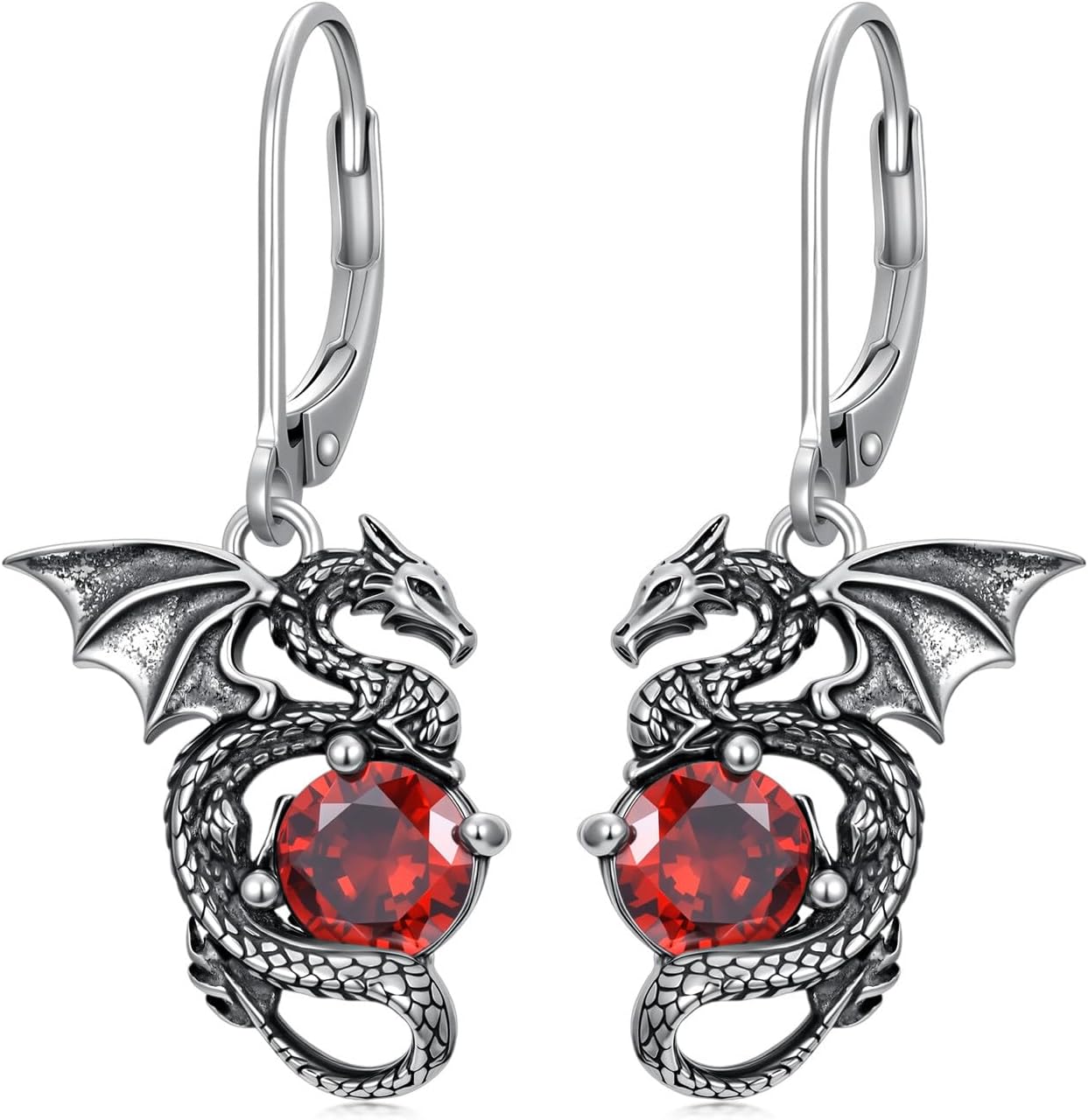 Dragon Dangle Earrings 925 Sterling Silver Vintage 6mm Round Garnet Dragon Leverback Earrings Jewelry Gift For Women