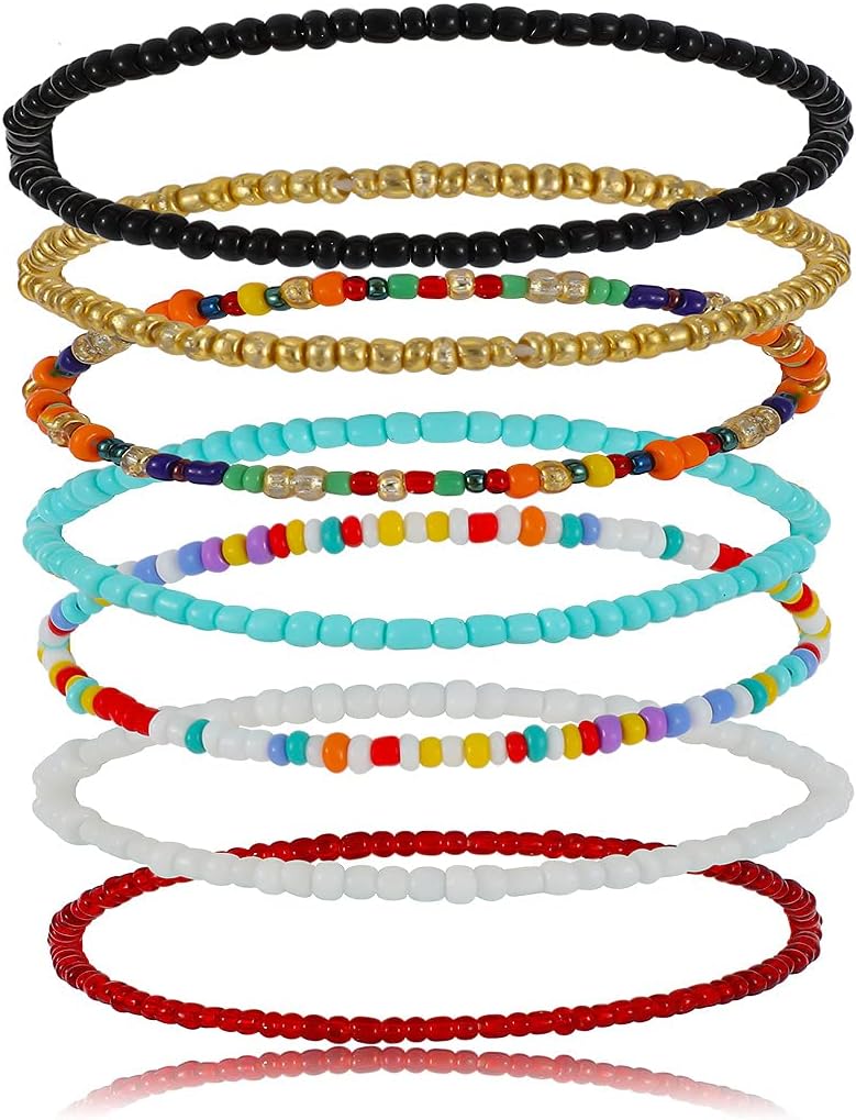 Pingyongchang Boho Handmade Beads African Anklets Set Layered Beach Colorful Stretch Beaded Elastic Foot Hand Chain Anklets Bracelets for Women Jewelry