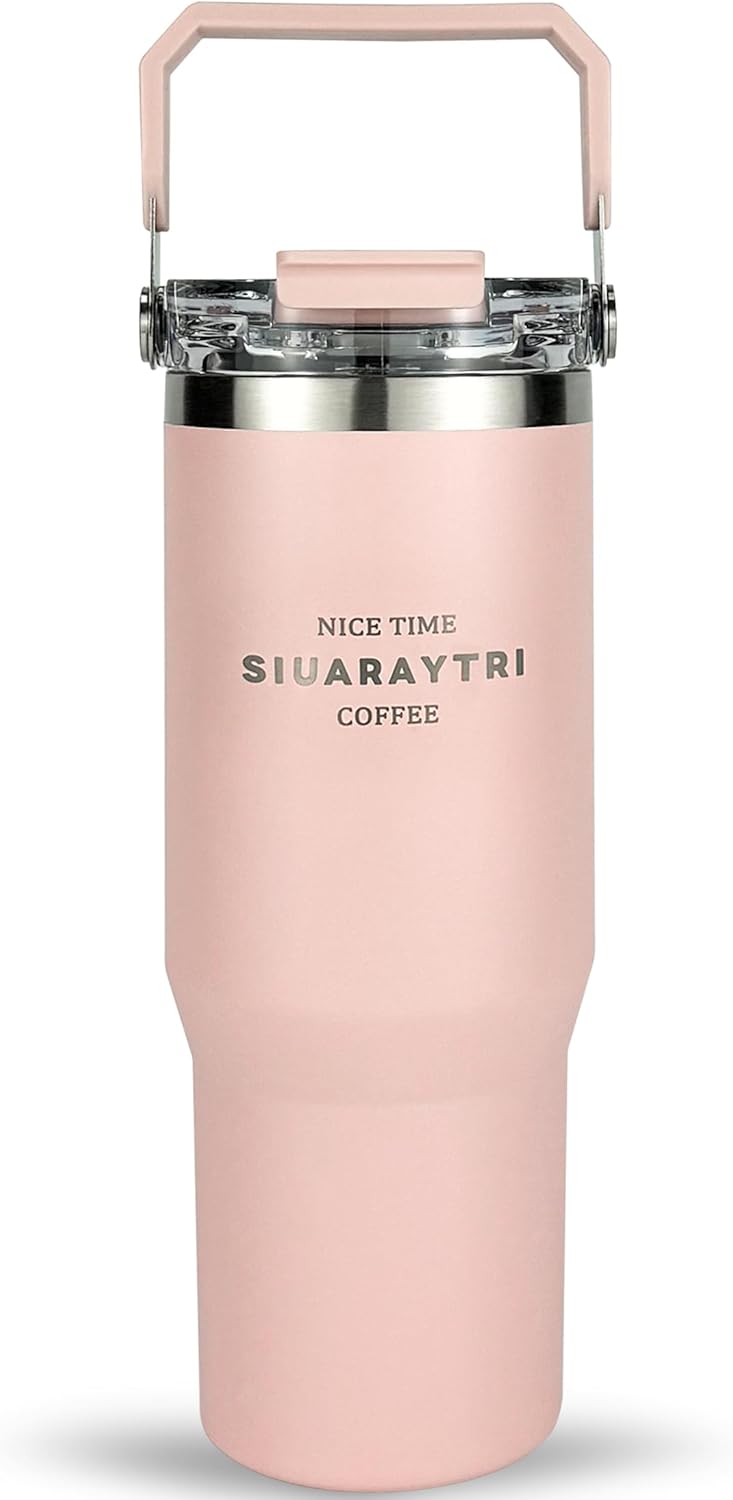 Insulated tumbler with lid and straw,tumbler with handle and flip straw cup traveler 30 oz water bottle mug Vacuum Sealed Cupholder Friendly BPA-Free Leak-Proof (Pink)