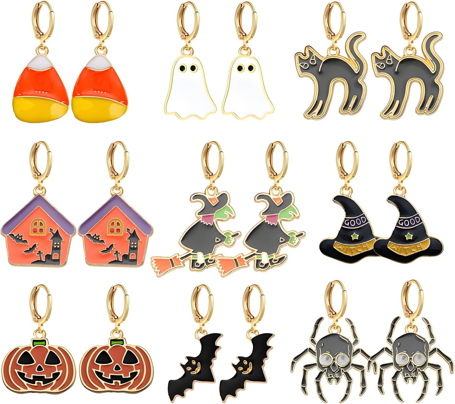 Dreuyet 9 Pairs Halloween Hoop Earrings for Women Unique Spooky Bat Ghost Spider Pumpkin Skull Cat Witch Crow Scary Dangle Drop Statement Earrings Halloween Cosplay Costume Earring Holiday Jewelry