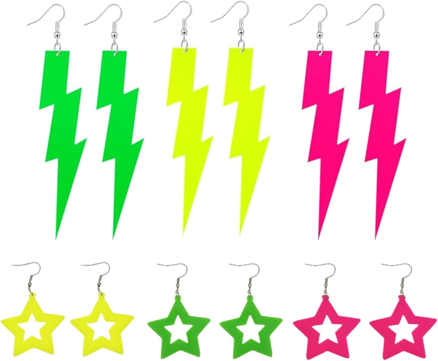 6 Pairs 80s 90s Neon Earrings for Women Colorful Star Acrylic Drop Earrings 80s 90s Lightning Drop Earrings for 90s 80's Outfit Glow Party Accessories